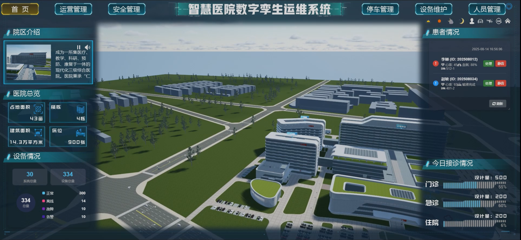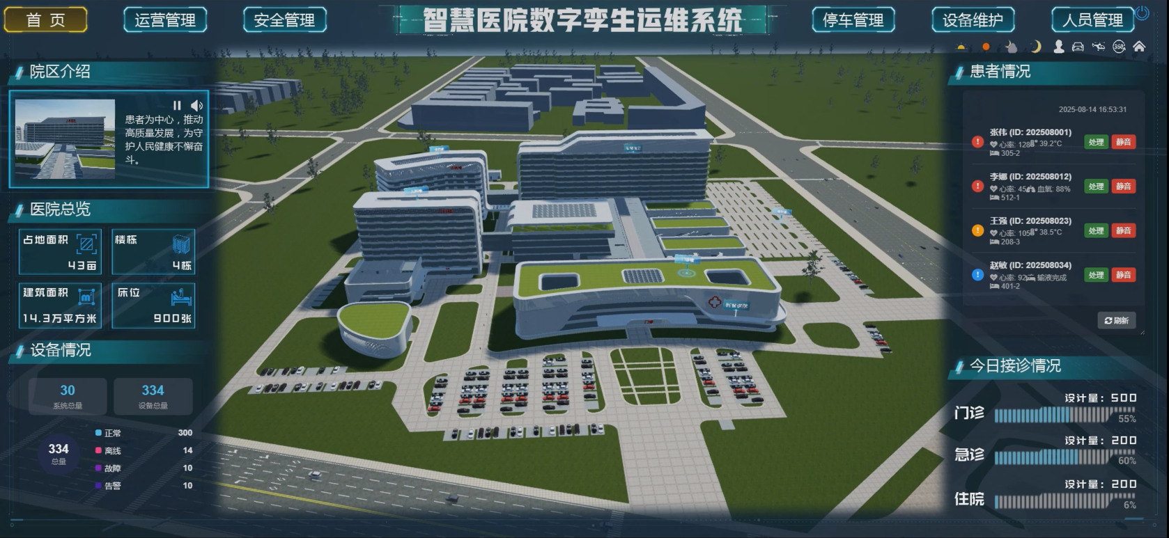 《八维时空医院数字孪生系统》是基于物理医院1:1映射的虚拟管理平台,通过物联网感知、大数据分析和三维可视化技术,实现医院全要素数字化管理与智能化决策。系统覆盖门诊楼、住院部、医技楼三大功能区,核心功能包括五大模块:一是运营管理,可缩短门诊患者等待时间20%、减少住院日5%;二是安全管理,实现人员、消防等全场景实时监控,异常响应≤30秒;三是设备维护,提升运维效率80%;四是停车管理,动态优化车位资源;五是能源管理,降低运营成本10%。通过"感知-传输-存储-应用"闭环体系,该系统有效提升医院资源利用率15%以上,患者满意度达90%以上。