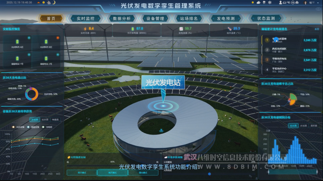 光伏电站电子沙盘管理平台是一个基于数字孪生与三维可视化技术的集中指挥中心。它通过构建电站实景的精细化三维模型,将分散的设备、实时运行数据(如发电量、辐照度)、告警信息乃至气象环境深度融合,实现电站全域状态的“一屏统览”与穿透式管理。管理者不仅能直观俯瞰电站全貌,还能动态模拟分析、进行发电推演与应急预案预演,从而将传统的数据监控升级为集全景监控、智能诊断、协同指挥与战略决策于一体的智慧大脑,极大地提升了大规模电站资产的管理效率与运营决策的科学性。