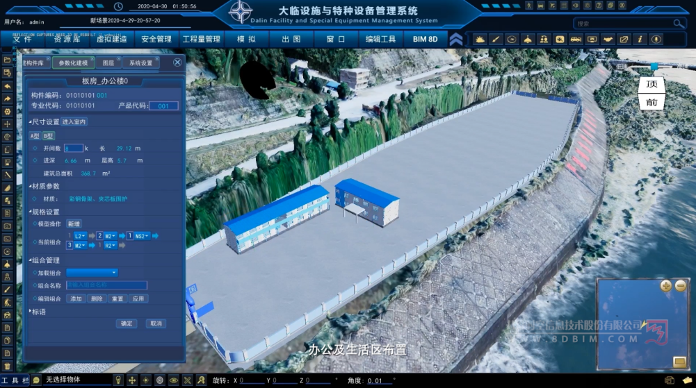 AI 智能三维三维临建布置系统融合人工智能算法、BIM 建模与三维可视化技术,针对施工现场临时驻地、加工场、拌合站、预制场、临时道路、水电管网等临建设施,实现智能化自动规划与优化布局。系统可依据项目场地条件、规范要求及施工组织逻辑,通过 AI 自动推荐最 优布置方案,自动规避空间冲突、减少交叉作业,并支持工程量核算、用地效率分析与方案比选。结合拖拽式交互与实时渲染展示,无需复杂建模即可快速生成合规、高效、经济的三维临建方案,大幅缩短临建策划周期,提升场地利用效率与施工现场标准化、数字化管理水平。